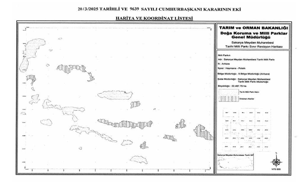 Sakarya Meydan Muharebesi Tarihi Milli Park revize planı Tarım ve Orman Bakanlığı Doğa Koruma ve Milli Parklar Genel Müdürlüğü tarafından hazırlanarak onaylanmak üzere ilgili makamlara gönderilmiştir. En son Sayın Cumhurbaşkanımızın 20.03.2025 tarihli 9639 sayılı Cumhurbaşkanı kararıyla onaylanarak resmi gazetede yayınlanmıştır. 14 parça olan tarihi milli park alanına 11 parça ve 8.637 ha alan ilave edilmek suretiyle güncellenerek 22.487 ha. çıkarılmıştır. Toplamda 154 adet şehitlik, 187 km sipere ulaşılmıştır. Yapılan bu çalışma ile toplamda milli park alanında %62,36’lık artış sağlanmıştır. Milli park alanında çalışmalar özellikle şehit mezarları ve siperler konusunda devam etmektedir.